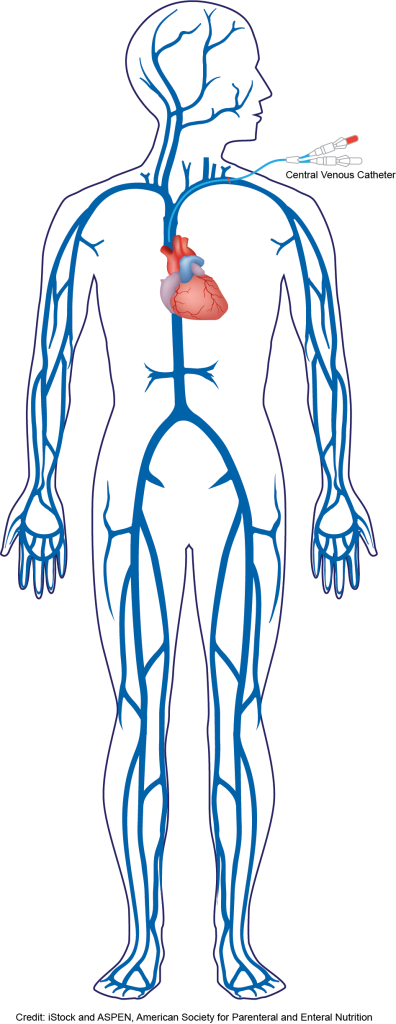 - Central IV catheter: a large-diameter high-flow vein, usually in the chest near the heart. If PN is to be administered as a concentrated solution or for more than a short time, this is the preferred route.
